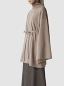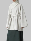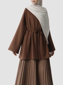 1.Atasan loose-fitting dengan desain lengan lebar, dilengkapi tali pinggang yang dapat dilepas pasang.